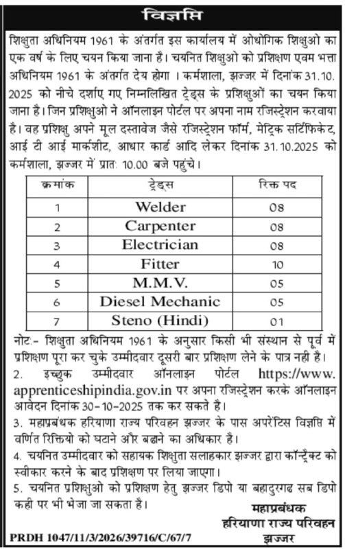 Haryana Roadways Recruitment 2025: Haryana Roadways (Haryana Roadways) has released a notification at hartrans.gov.in for recruitment to the Post of Apprentice in Jhajjar – Haryana. Interested candidates can Apply Online/Offline on or before 30-Oct-2025