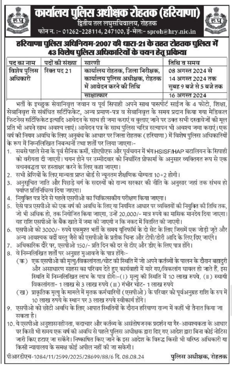 Rohtak Police Department Recruitment 2024: Rohtak Police Department (Rohtak Police Department) has released a notification at rohtak.haryanapolice.gov.in for recruitment to the Post of Special Police Officer in Rohtak – Haryana. Interested candidates can Apply Offline on or before 14-Aug-2024